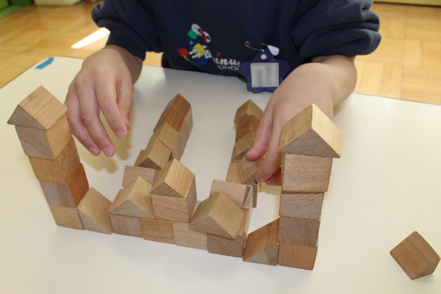 積み木を組み立てては壊し、再び組み立てる事を繰り返しながら適度な緊張感と開放感が子どもの発想を豊かにし、時には息を呑み慎重に、時には大胆に構築しながら創造性や巧緻性を育みます。