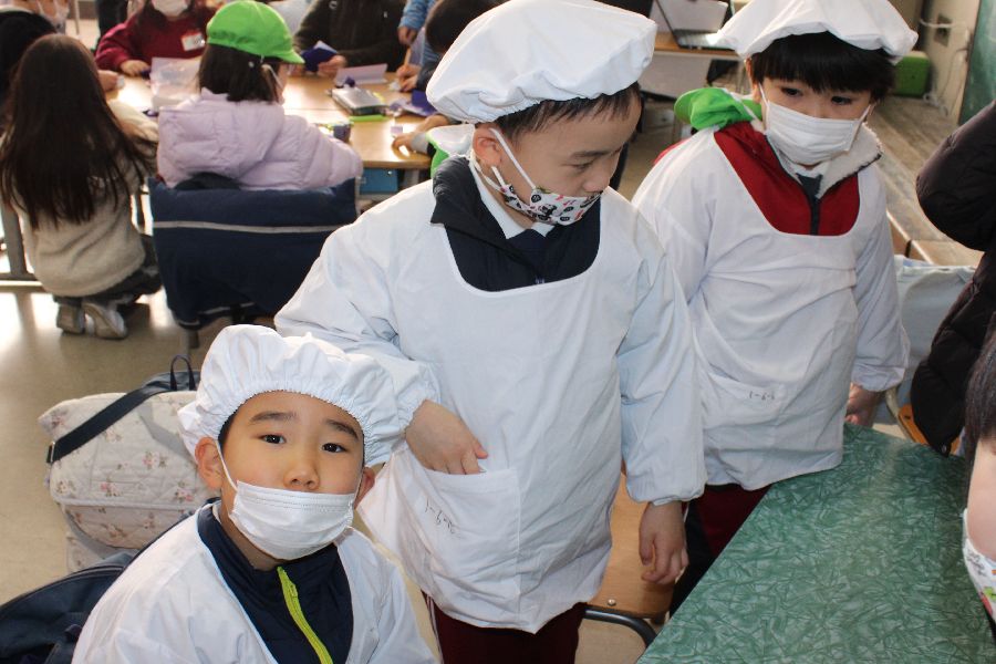 その他、防災の事を学んだり、給食を配膳する時に着用する割烹着を着せてもらったり、