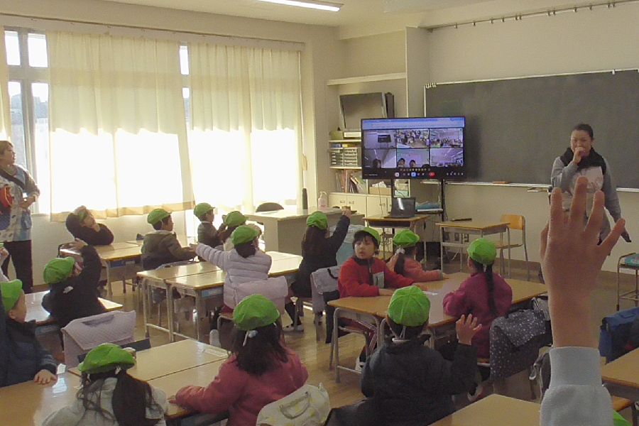 到着すると教室のモニターには他のクラスの様子がライブ配信されていて、全クラス一斉に歓迎の歌を歌ってくれ交流会が始まりました。